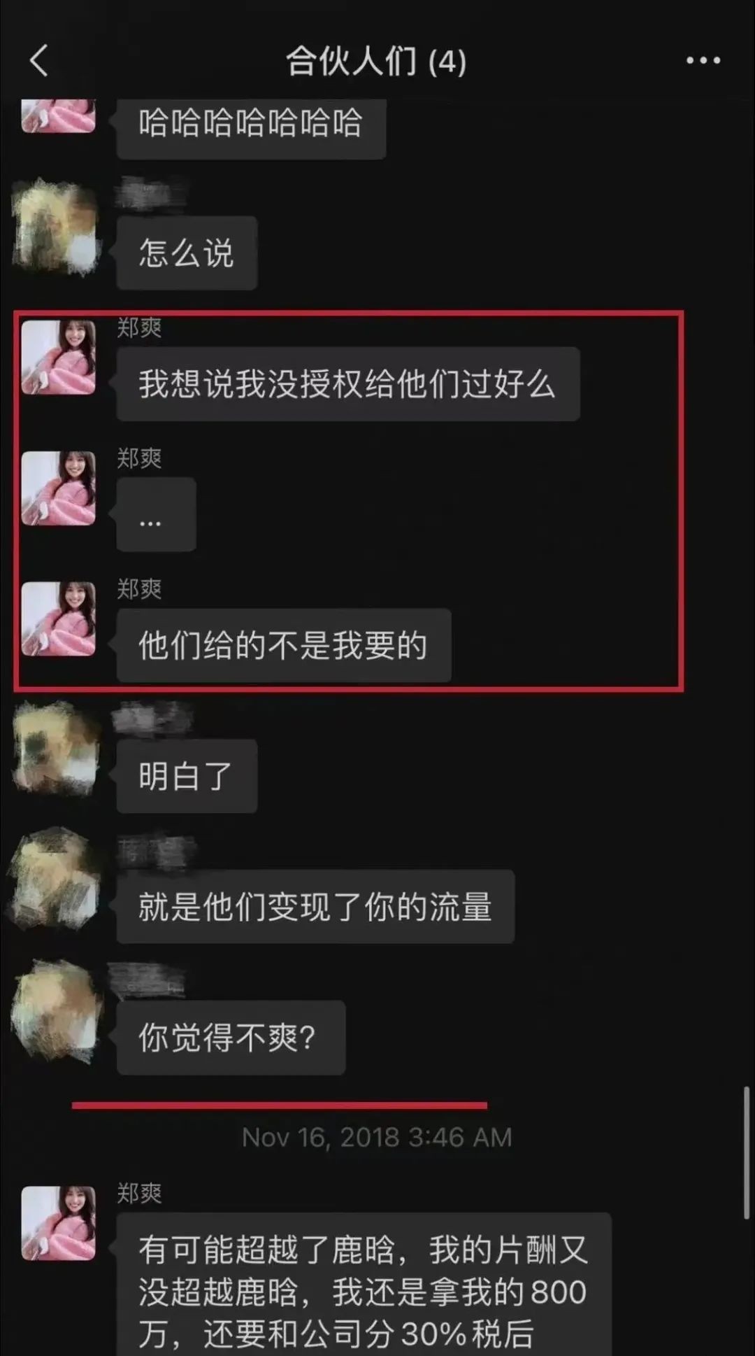 紧接着,郑爽更是在聊天里沾沾自喜自己的流量超过了鹿晗,但片酬又没法超过鹿晗,显然依然对粉丝的卖力程度不够满意。