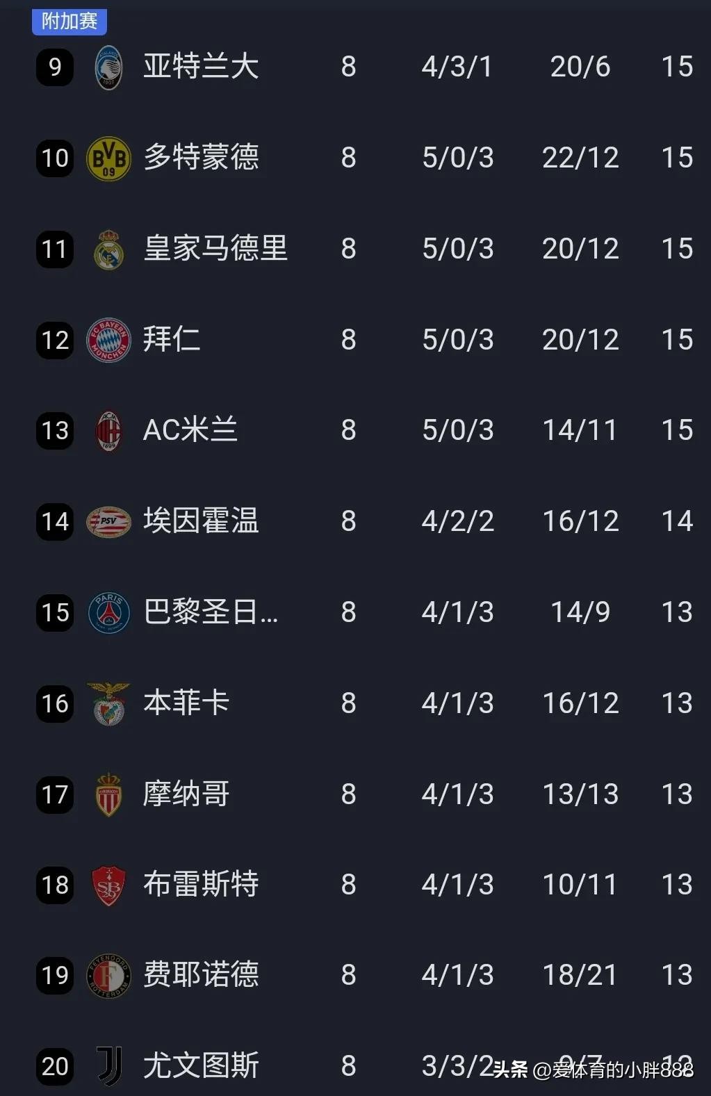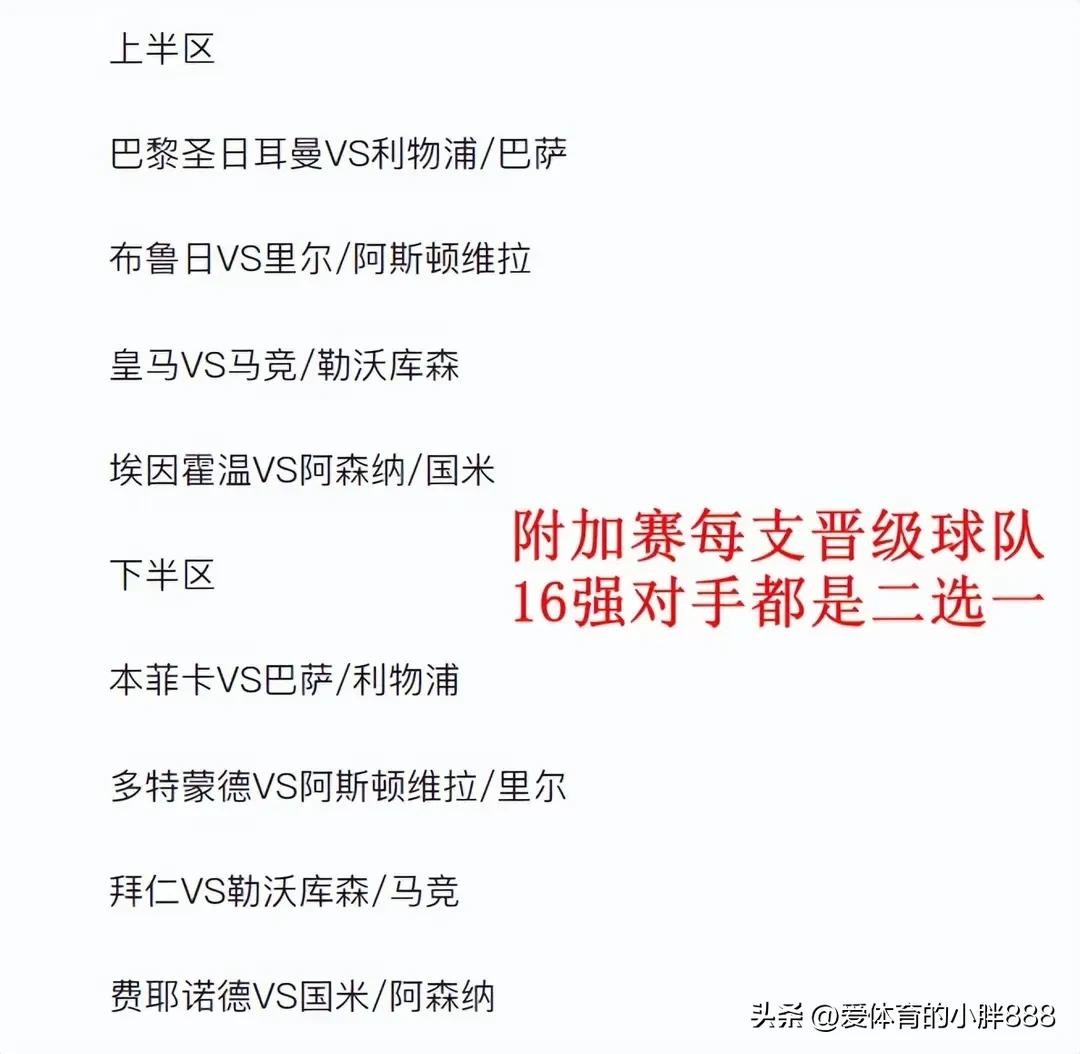 通过附加赛晋级的球队分别是:多特蒙德、皇家马德里、拜仁、埃因霍温、巴黎、本菲卡、费耶诺德、布鲁日!