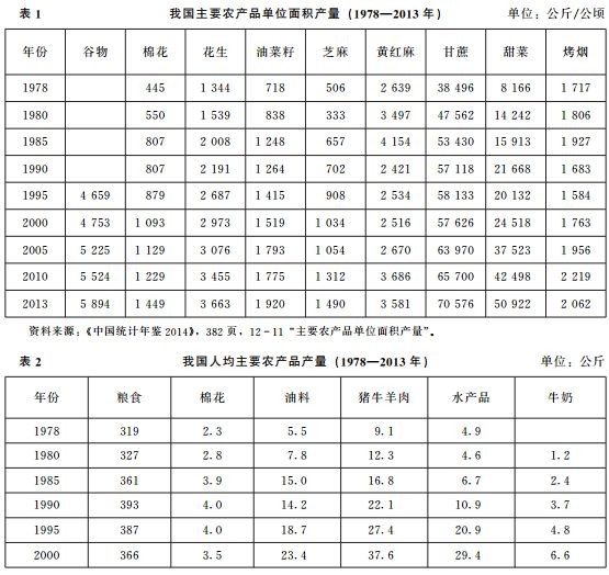 下面来看一下我国的实际情况。我国近几十年来人口增长迅速,作为一个人口大国,我国居民对粮食等农产品的需求是巨大的。表4—2和表4—3分别是我国在1978-2013年间主要农产品单位面积产量和人均主要农产品产量的统计表。