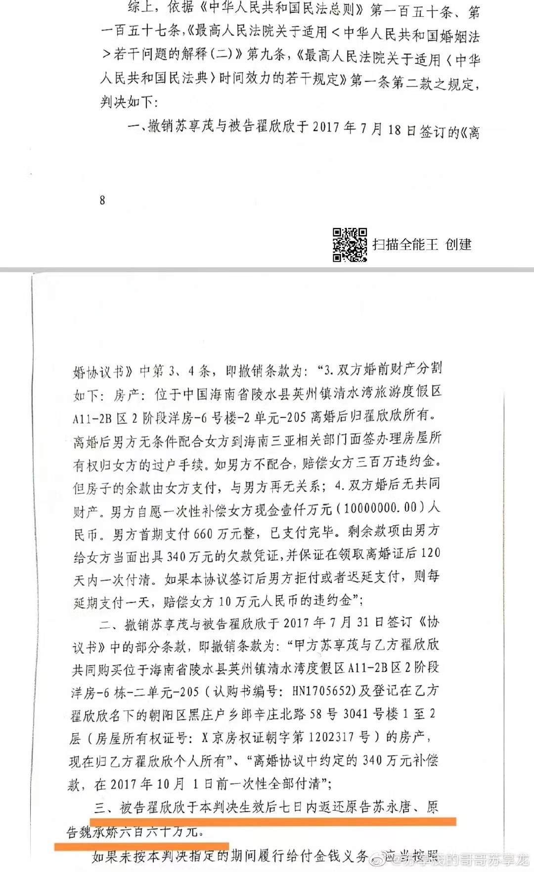 2023年4月,苏享茂家属和翟欣欣之间的民事案件一审宣判。苏享茂家属在社交平台公布的离婚后财产纠纷案、赠与合同纠纷案判决书显示,法院判决撤销苏享茂和被告翟欣欣于2017年7月18日签订的《离婚协议书》中提及海南房产归翟欣欣所有、1000万元现金补偿的相关条款;撤销苏享茂和翟欣欣于2017年7月31日签订的《协议书》中提及海南、北京两处房产归翟欣欣个人所有、340万元补偿款相关条款;被告翟欣欣于判决生效后返还原告660万元。在赠与合同纠纷案中,法院判决被告翟欣欣退还原告钻戒、项链、轿车等钱财。