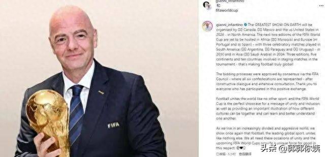 国际足联主席因凡蒂诺在社交媒体上表示:“地球上最大的赛事将于2026年在北美、美国、加拿大和墨西哥举办;接下来的两届赛事将于2030年在非洲(摩洛哥)和欧洲(葡萄牙和西班牙),以及三个南美洲国家(阿根廷、巴拉圭和乌拉圭)的百年庆典;2034年将由亚洲(沙特阿拉伯)主办。三项赛事、五大洲、十个国家参加,这使得足球成为真正的全球性。
