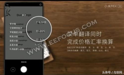 小米MIX 2S基于AI,相机可拍摄外文菜单,实时翻译,甚至价格都可实时换算成人民币。