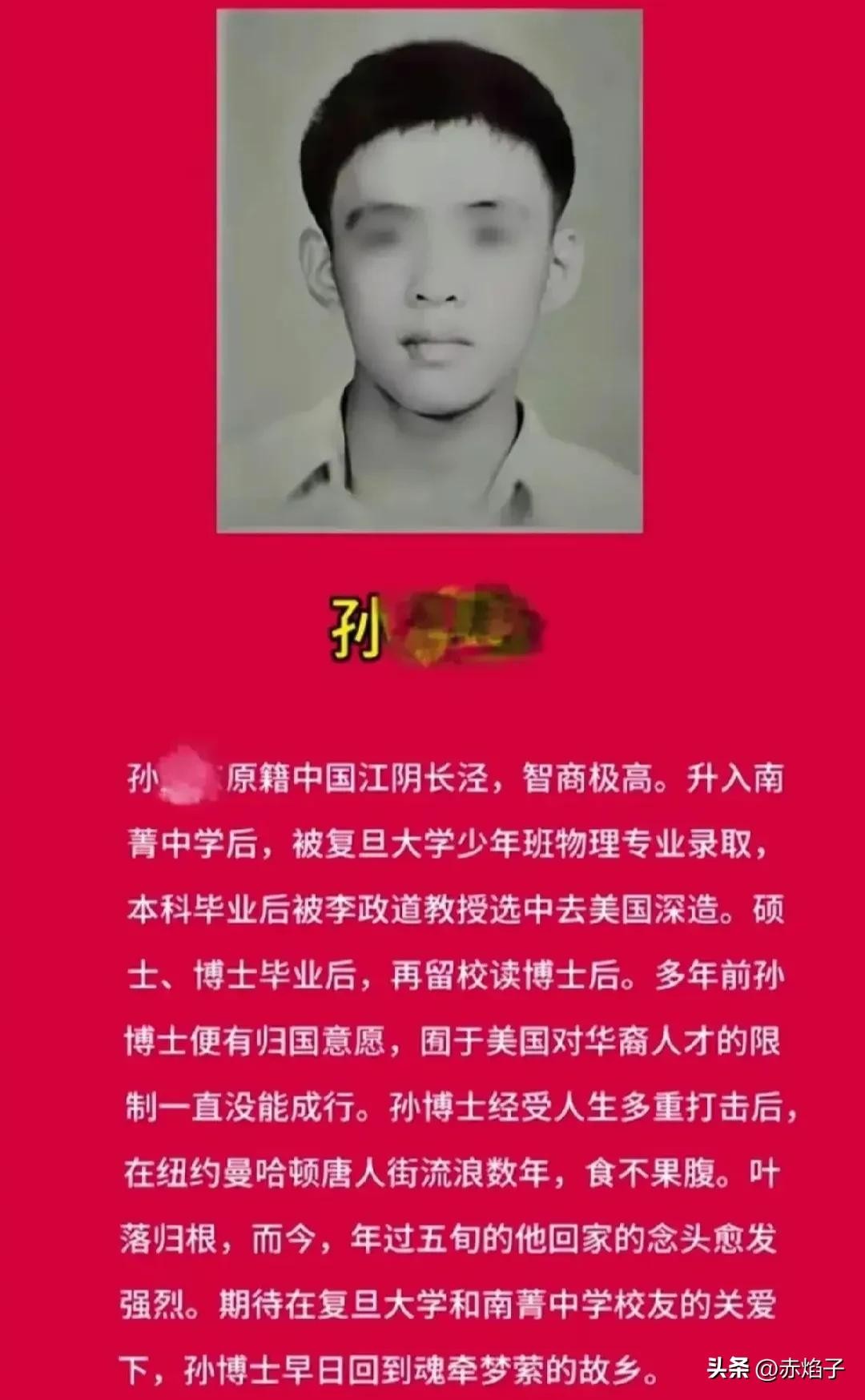 孙博士当年被誉为神童,1985年1月被复旦大学少年班物理专业录取,本科毕业后被李政道教授选中去美国深造,硕士、博士毕业后,再留校读博士后。