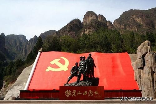 狼牙山五勇士纪念塔抗日战争时期,狼牙山是著名的抗日根据地。1941年9月25日,马宝玉、胡德林、胡福才、葛振林、宋学义五名战士为掩护主力部队转移,被敌人逼到狼牙山顶峰,跳下了悬崖。这就是著名的狼牙山五勇士。五勇士跳崖后,马宝玉、胡德林、胡福才为国捐躯,壮烈牺牲,葛振林、宋学义被悬崖上的树枝挂住而得救。