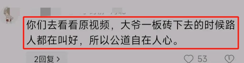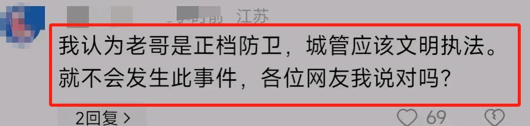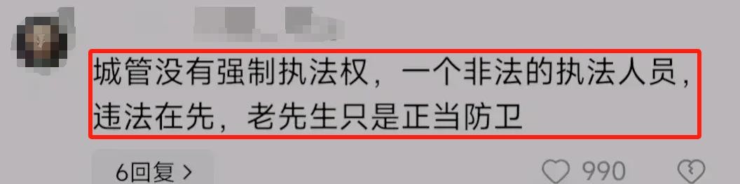有的网友站在大爷这边,觉得他没啥错,毕竟,大家看视频的时候,听到周围人都在叫好,感觉大爷是在正当防卫。他们说城管执法得文明点,不能这么粗暴。
