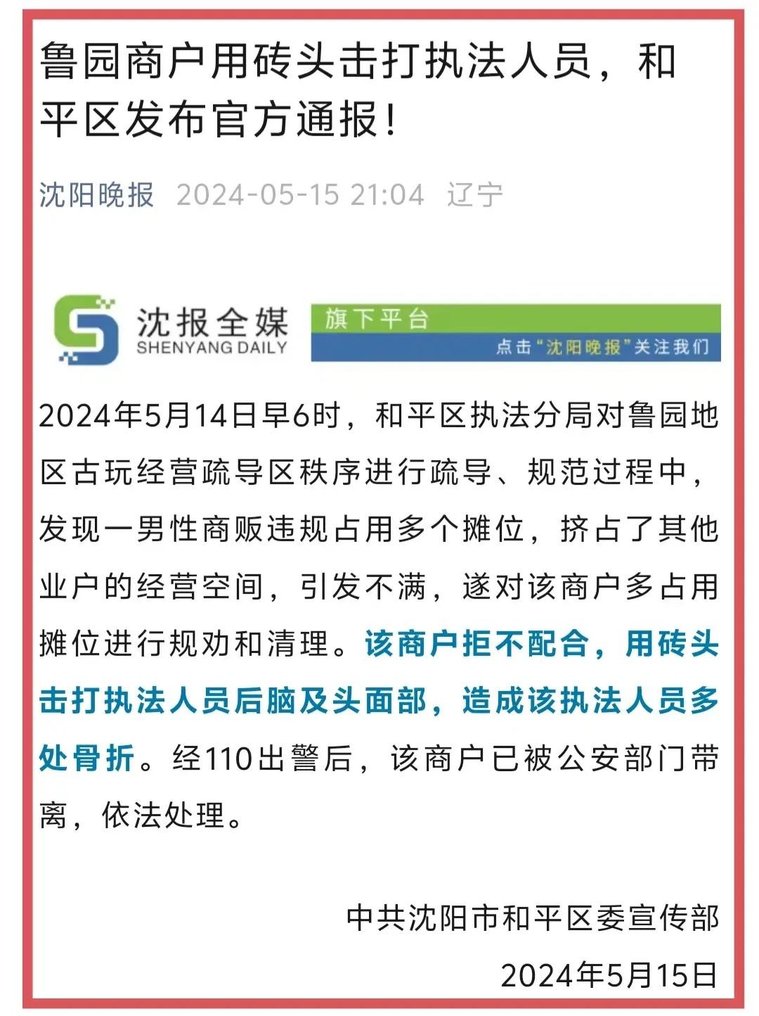 沈阳南湖那边的执法科工作人员说了,他们有个队员被打得不轻,后面肯定要对打人的大爷进行处罚。