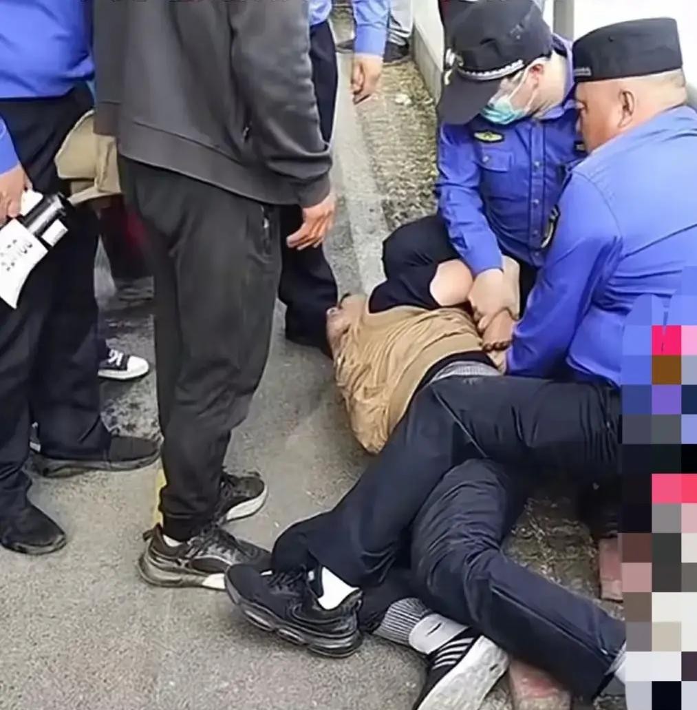 城管被砸倒在地,其他执法人员一拥而上,把大爷按住了。