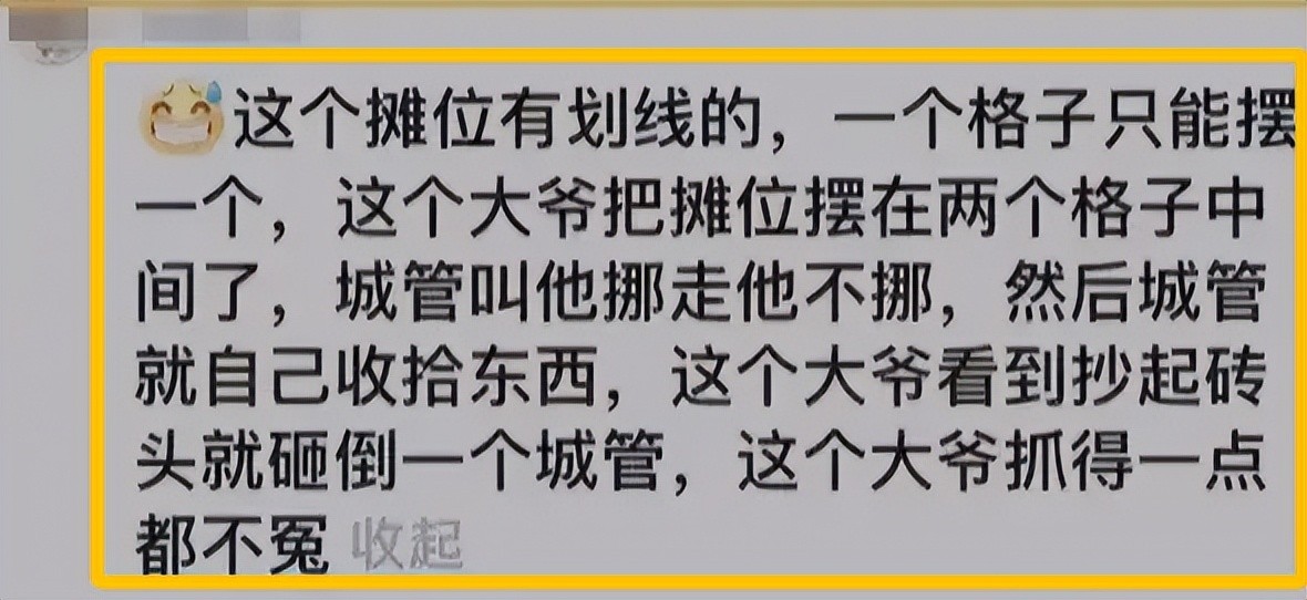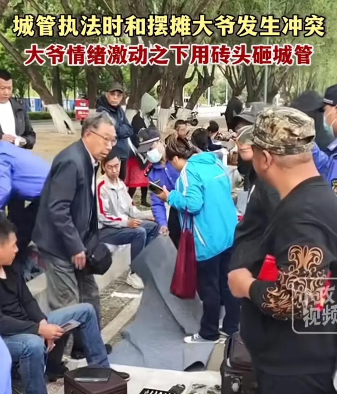 这个视频显示,大爷和城管之间可能因为摆摊的事情意见不合,双方你来我往的,气氛挺紧张。后来,情况升级,大爷可能是太生气了,就拿起旁边的砖头向执法人员砸去。