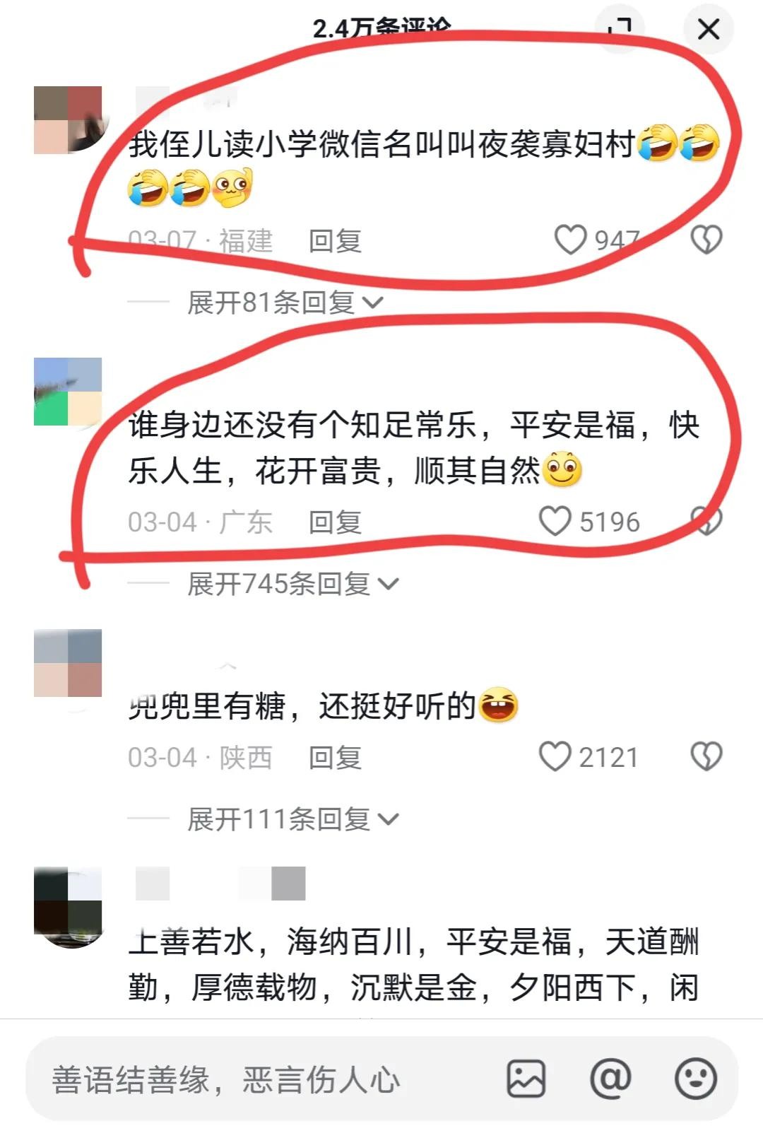 微信作为现在的社交媒体平台之一,不管是男女老少都在使用,不仅可以聊天,语音通过,视频通过还有多人视频聊天等,以前只能打电话,但是不能看见对方,但是现在的社交软件越来越多,让我们不管是在家里,还是在外面只要想对方了就可以一个视频电话打过去,就可以看见彼此在干嘛,微信昵称也是陈出不穷,各式各样,老年人在使用社交媒体平台上也展现出了他们独特的风格,微信昵称更是让人忍俊不禁。在评论区里,有的老年微信名可谓是惊掉下巴。让我们一起来看看这些令人捧腹的微信名吧!