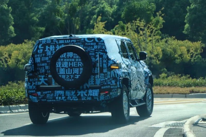 从谍照上来看,新车有着方正的整体设计,车侧线条平直硬朗,轮眉部分很粗壮。车尾部分,后风挡与后尾门接近垂直角度,与整车硬朗的设计相契合,尾灯等细节目前仍采用临时组件。新车整车体型相当巨大,离地间隙非常高,并配备有裸露的外挂备胎,有着很大的接近角、离去角,保证车辆的通过性。新车预计会采用硬派越野常见的非承载式车身。