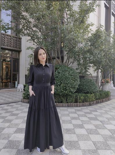 A字型长裙很好地修饰了她的身型。虽然全身照看起来依旧暴露身高和腿长短板,搭配的白色运动风高跟鞋也颇有些违和,但阿娇笑容满面,红唇也衬出了好心情。