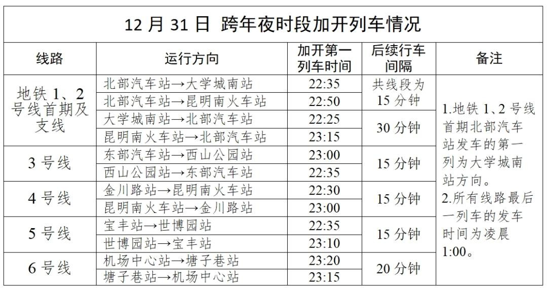 2023年12月31日,昆明地铁全线网加开列车,运营时间延至2024年1月1日凌晨1:00,保障市民平安归家。31日适逢跨年夜,为避免加剧主城区道路交通拥堵,建议广大市民尽量使用公共交通绿色出行。