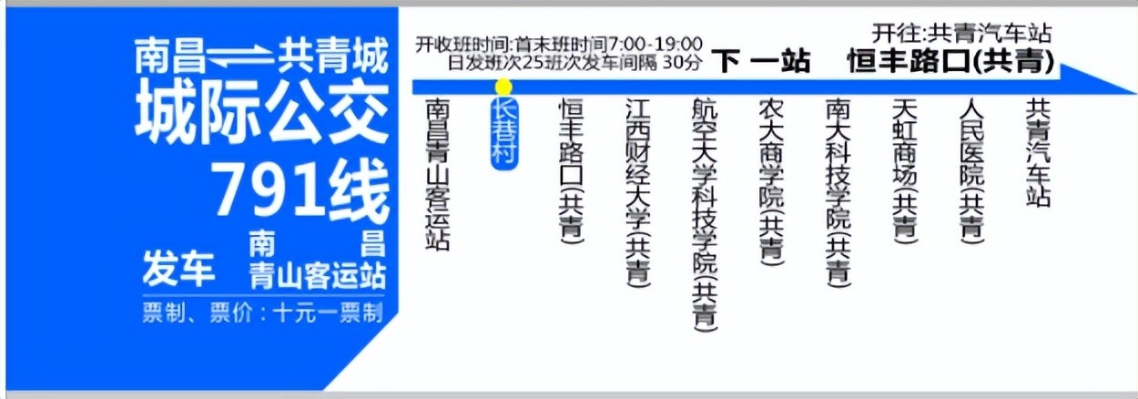 其中南昌至共青城城际公交,实行10元/每人一票制。班线从青山客运站始发,每日7:00—19:00每30分钟一班,每天发25个班。具体的乘坐公交站点为:南昌青山客运站→长巷村→恒丰路口(共青)→江西财经大学(共青)→航空大学科技学院(共青)农大商学院(共青)→南大科技学院(共青)→天虹商场(共青)→人民医院(共青)→共青汽车站,往返线路相同。全程约89公里,运行时间约1小时50分钟。