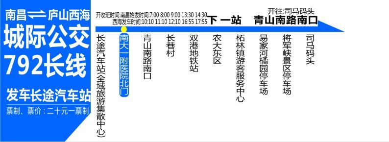 南昌至庐山西海(司马码头)城际公交,实行20元/每人一票制。班车由南昌长途汽车站始发,全天往返共10个班,具体发班时间:南昌始发时间为7:00,8:00,9:00,13:30,14:30;西海发车时间为10:10,11:10,12:10,16:55,17:55。具体的乘坐公交站点为:南昌长途汽车站(南昌全域旅游集散中心)→南大一附医院北门→青山南路南口→长巷村→双港地铁站→农大东区→柘林镇游客服务中心→易家河橘园停车场→将军峡景区停车场→司马码头。全程约120公里,运行时间约2小时40分钟。