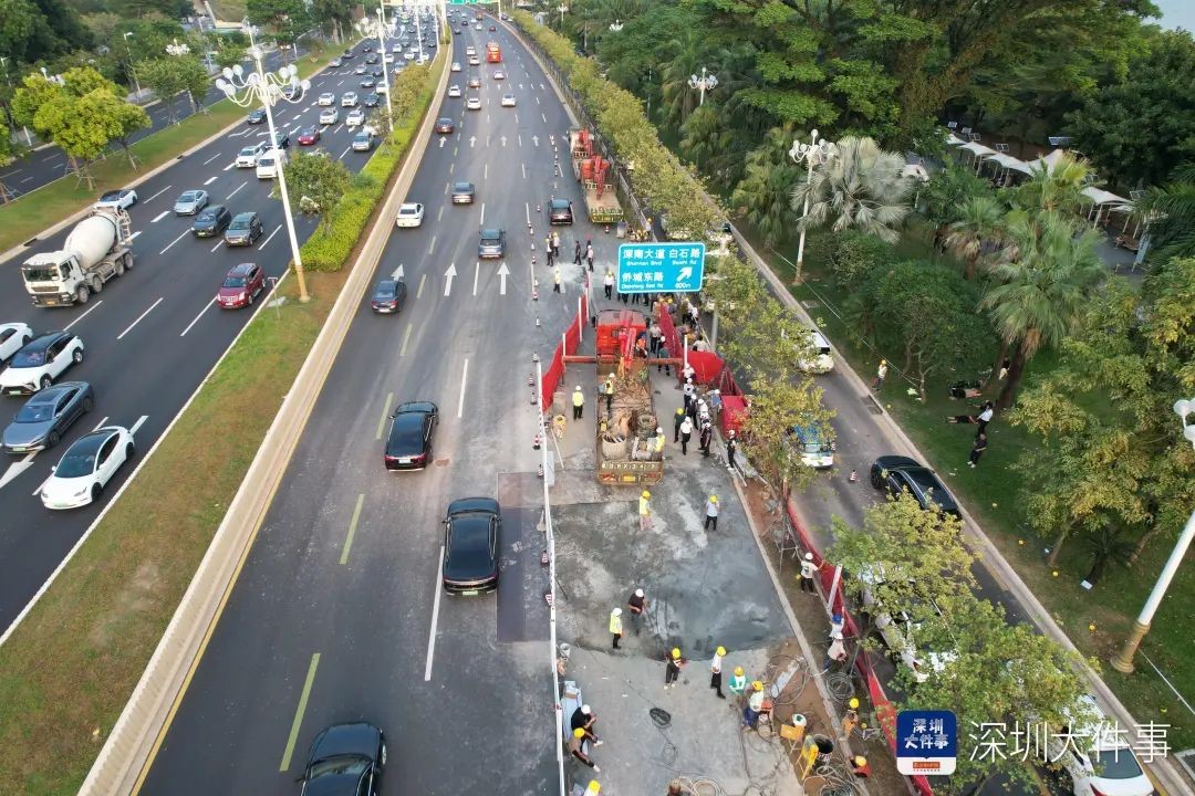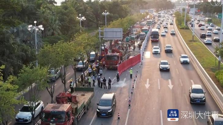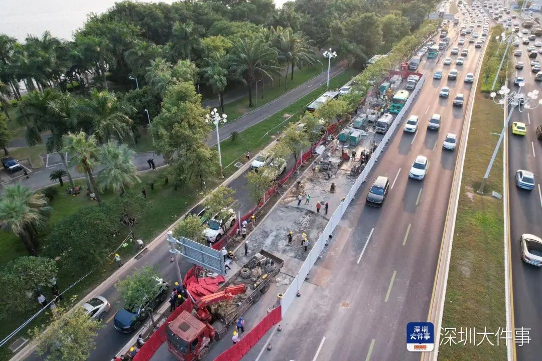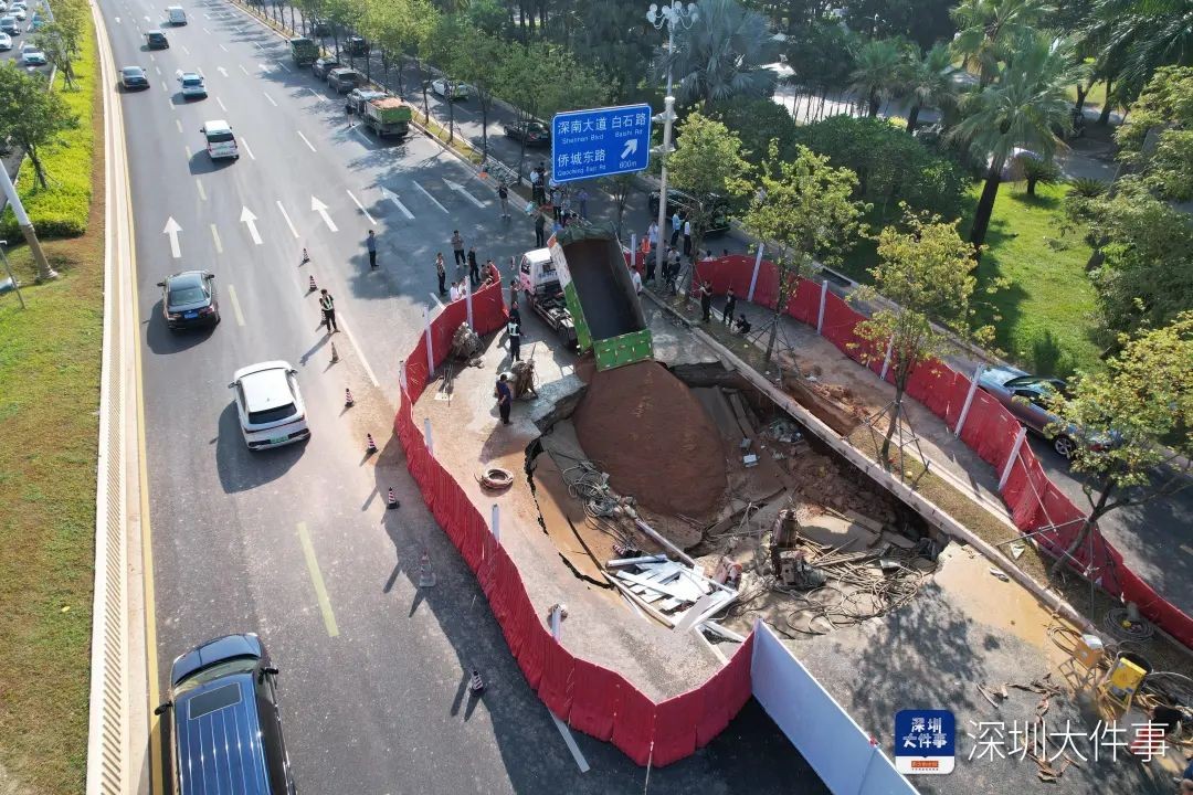 险情发生后,立即启动了应急预案,交通、交警、住建、地铁集团等单位第一时间赴现场处置,实行交通管制,滨海大道西向东方向封闭四车道。截至12日中午12时30分已完成塌陷区域回填处理,目前同步进行现场监测及地质雷达扫描,在确保安全的前提下,预计12日晚恢复受影响路段交通通行。