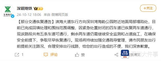 18时06分,深圳地铁官方微博通报最新进展,滨海大道东行方向深圳湾海韵公园附近地面局部塌陷处,目前已完成回填处理和围挡范围调整,因紧急处置封闭的四车道已恢复两车道通行。现该路段共有五条车道可通行,剩余两车道仍需继续安全监测和占道施工,后续将在确保安全前提下,争取尽早恢复通行。