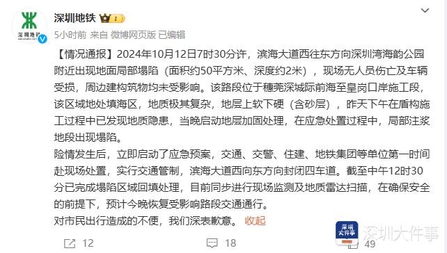 据南都此前报道,12日中午,深圳地铁官方微博发布情况通报,其中提到,10月12日7时30分许,滨海大道西往东方向深圳湾海韵公园附近出现地面局部塌陷(面积约50平方米、深度约2米),现场无人员伤亡及车辆受损,周边建构筑物均未受影响。