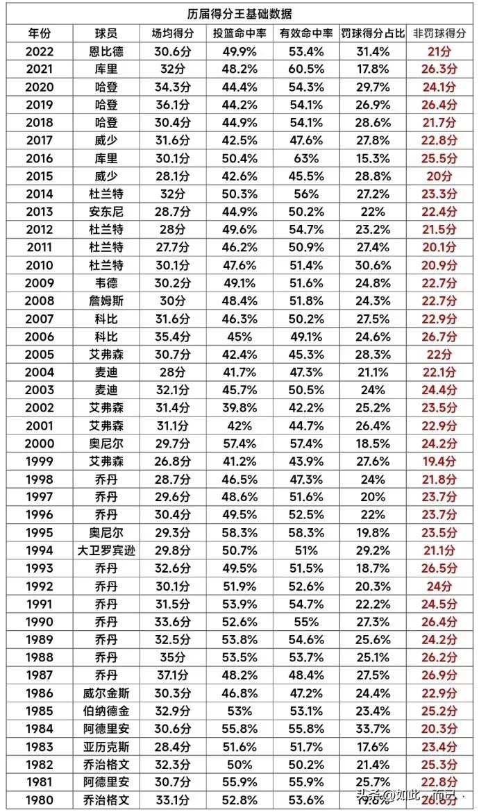 NBA联赛1980-2022年历届得分王的场均得分、投篮命中率、真实命中率及罚球得分占比,真没想到哈登居然不是最高的!
