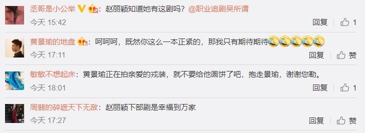 没有任何确切的官宣开拍消息,竟突然冒出来要开播的消息?粉丝们纷纷表示难以相信。从评论区的留言来看,赵丽颖和黄景瑜的粉丝都对这个消息持怀疑消息。赵丽颖的粉丝甚至评论说:“赵丽颖知道她有这剧吗?”也是相当幽默了。