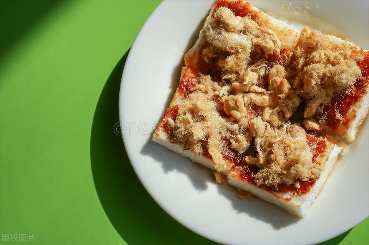 9. 吐司肉松:在吐司上放肉松、黄油等,用烤面包机或烤箱加热可食;