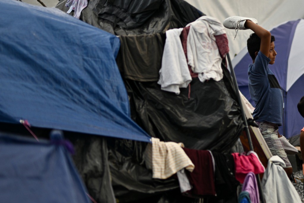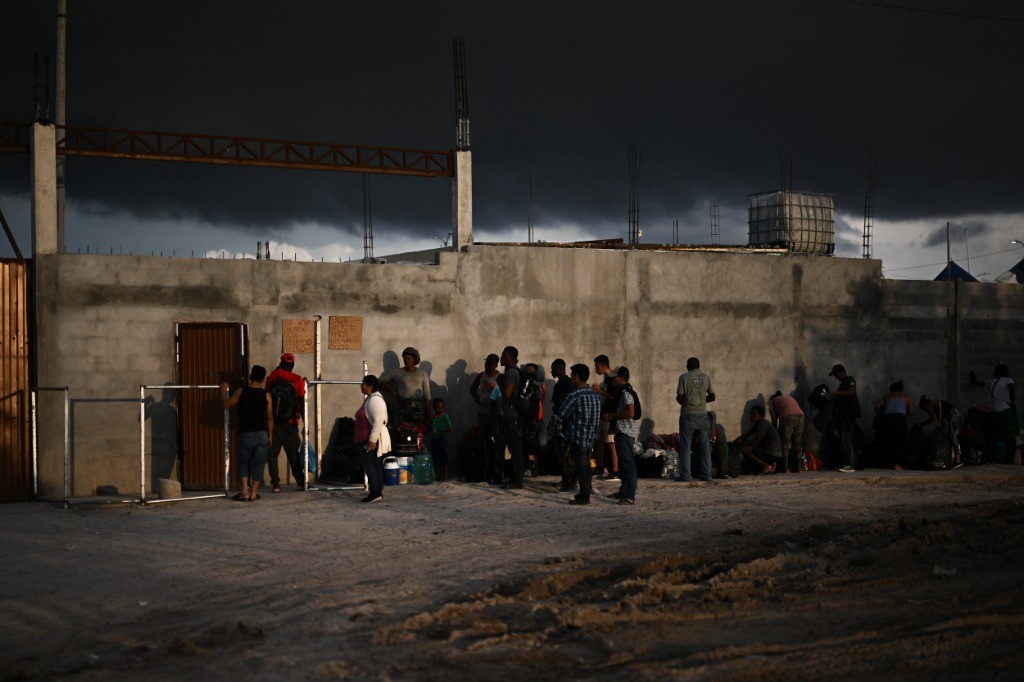 5月16日,移民在美墨边境城市墨西哥雷诺萨的一处收容所外等待进入。新华社记者辛悦卫摄