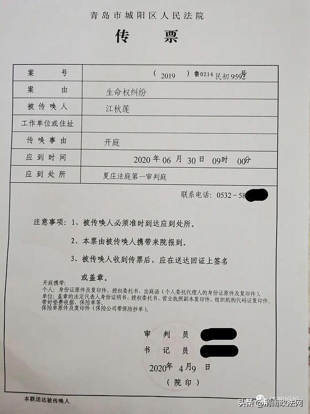 新京报记者4月13日从江歌的母亲江秋莲处获悉,她已接到法院的开庭传票,法院已定于今年6月30日上午9点在青岛市城阳区法院夏庄法庭开庭审理此案。