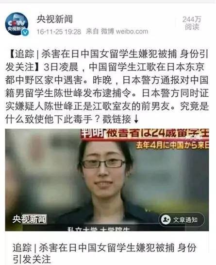2016年11月,中国女留学生江歌在日本中野家中遇害。日本警方以杀人罪对中国籍男性留学生陈世峰发布逮捕令,陈世峰是江歌室友刘鑫的前男友。