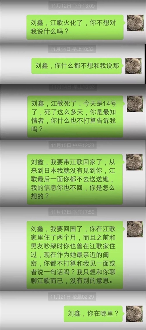 11月3日下午(案发时是3日凌晨),江歌的母亲江秋莲惊闻女儿离世,她不断发消息向刘鑫求证。