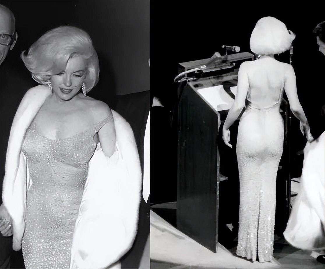在肯尼迪的生日宴会上,她身穿着这件衣服,露出了美丽妖娆的后背,贴身肉色的晚礼服,仿佛什么都没有穿一样。