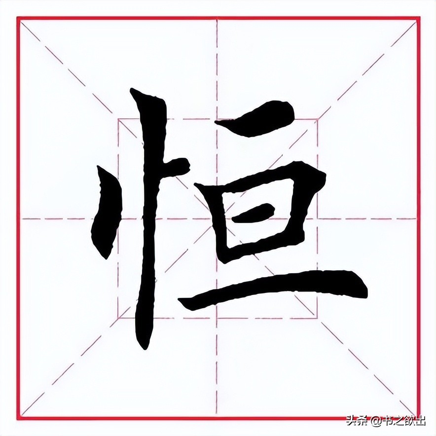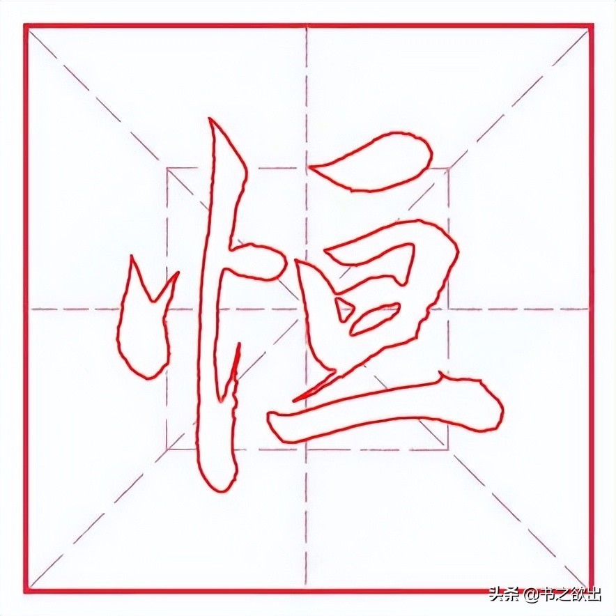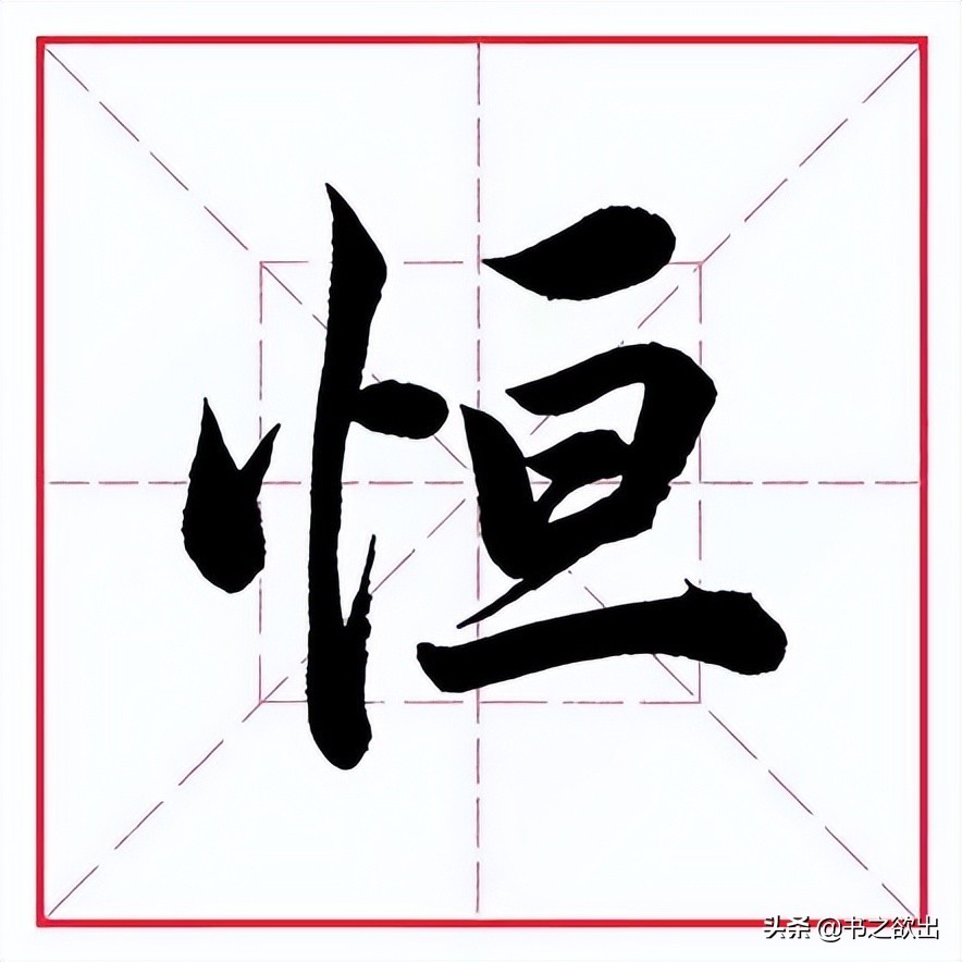 左边“忄”不要写宽,首笔为左竖点,以露锋入笔,稍左斜,稍重,勿长;第二笔右点写成小横点,要轻巧,与左竖点的起笔基本平齐,并且注意两点之间的距离不要过远;竖笔起笔稍重,角度略平,然后转中锋向下行,挡住横点的起笔,竖身稍左斜,中间稍细,劲挺有力,最后以垂露收笔,不可悬针。