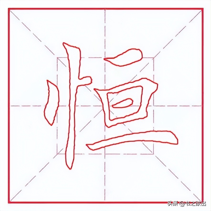 右部“亘”字首横起笔略低,抗肩圆收,稍厚重,勿长;“曰”部斜势抗肩,上宽下窄,与首横直对。左竖起笔稍靠左,向下略轻,右斜;横折与左竖虚接,横画抗肩,勿重,行至首横的收笔下方稍提锋顿笔向左下写右竖;中间小横稍偏左,抗肩角度一致;底横实接左竖的收笔,与上面两个横画间距相等,收笔托住右竖;最后长横起笔左探,左轻右重,收笔稍下压,略呈拱形,等距。