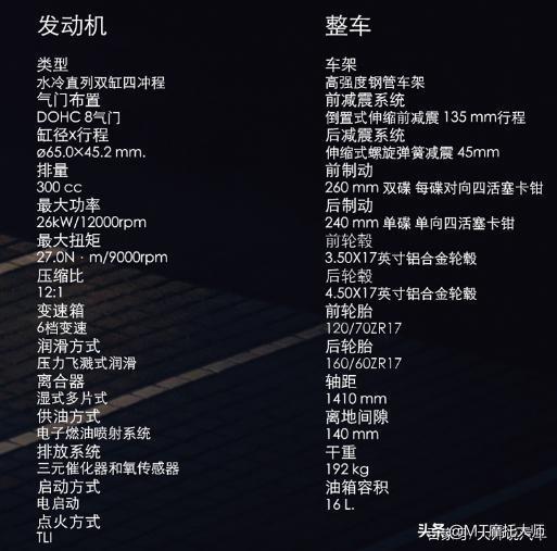 在车辆的核心部分也就是这款车搭载的发动机,这款发动机也是进行了全新的设计,发动机为直列同步双缸发动机,实际排量为300CC,拥有12:1的高压缩比。从官方公布的数据来看,这款发动机的最大功率达到了28.0kW/11000rpm(老款26 kW /12000 rpm),最大扭力25.6N·m/9750rpm(27 Nm/ 9000 rpm)。