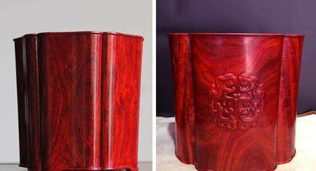 上图:两个材质相似的笔筒,左为檀香紫檀,右为染料紫檀