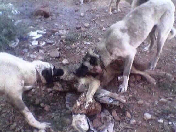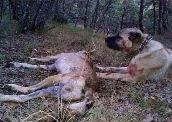 这是坎高犬正在与大灰狼撕战,它们面目狰狞,团结抗敌。狼已经完全被钳制住,没有一丝逃跑的希望