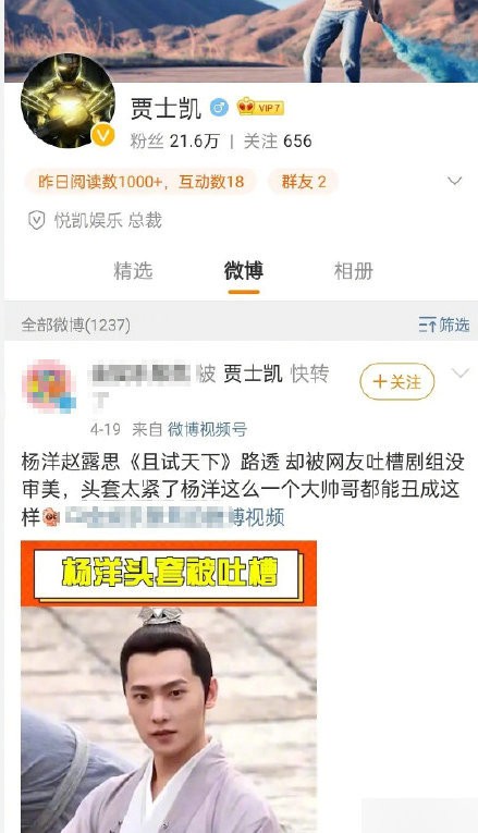 4月21日,有网友发现杨洋经纪人贾士凯快转了一条吐槽杨洋剧中造型的微博,随后秒删,引发热议。