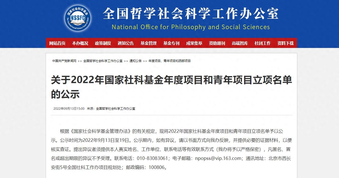 9月13日,全国哲学社会科学工作办公室公示了2022年国家社科基金年度项目和青年项目立项名单。
