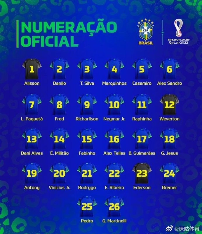 巴西公布世界杯球衣号码:内马尔身披10号,维尼修斯20号、理查利森9号