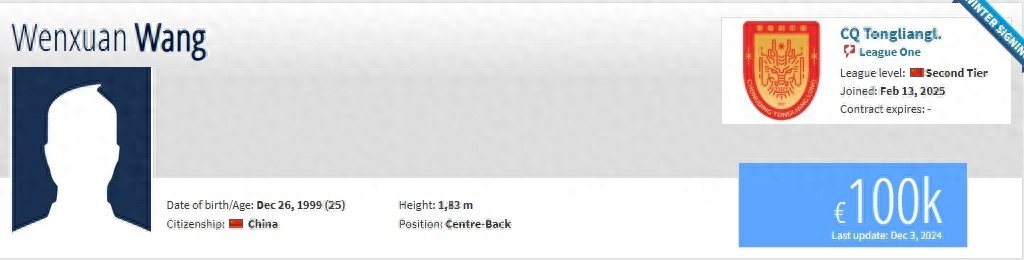 德转更新,原广州队后卫王文轩自由身加盟重庆铜梁龙。