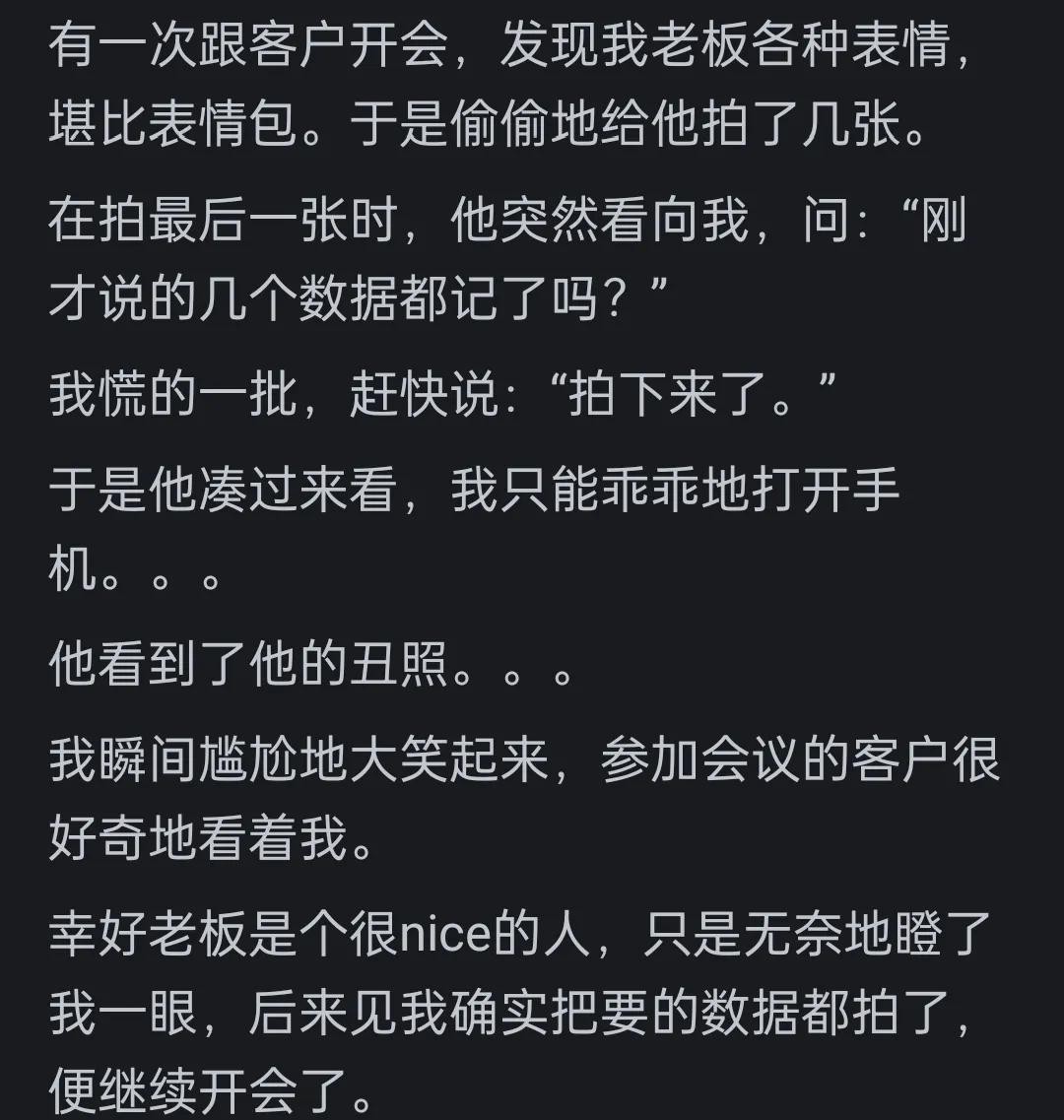 说明你们关系很好、公司氛围融洽。要是老板是个讨厌货,再表情包也不会拍照,翻到了平白恶心自己