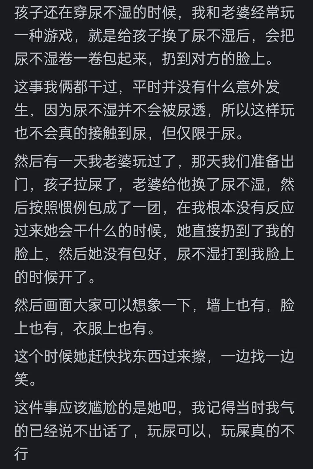 我和老婆也玩过,我没有你这么惨,但是我们俩同一个尿不湿反复扔,大力出奇迹,我老婆太用力把尿不湿外面的布仍破了,里面的东西都撒到我脸上了。