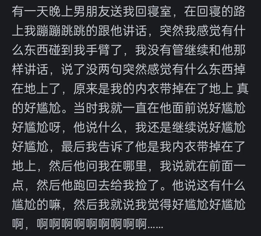 啊?不理解,内衣带子掉了,要不就是大大方方捡起来啊,或者就是趁黑没发现直接不说,默默走开啊,为啥一边走一边说好尴尬好尴尬啊?我想起来这个场景就觉得比内衣带子掉还尴尬。