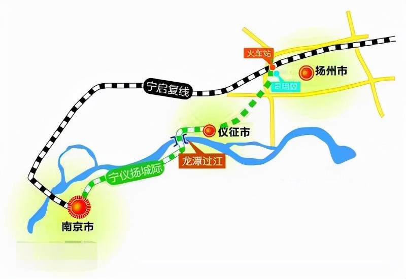 宁扬城际(南京地铁S5号线)对接南京地铁2号线的经天路站,向东后与南京地铁4号线的仙林湖站实现同站台换乘,然后过江一路可以到仪征火车站附近。目前南京地铁4号线仙林湖站正在建设中,将预留与宁仪扬城际铁路对接的交接口,从龙潭过江进入仪征市区,远期通往扬州火车站。值得注意的是,这将是国内建设的首条跨越长江的城际地铁线路。
