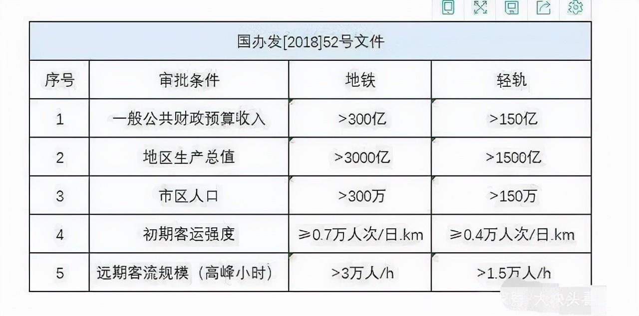 52号文对修建地铁的城市提出限制标准:城市一般公共财政预算收入应在300亿元以上,地区生产总值在3000亿元以上,市区常住人口在300万人以上。