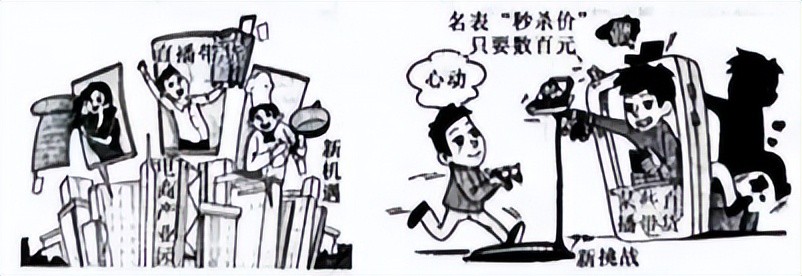 据上述漫画,简要评价网络直播带货,并谈谈你对网络的认识。(3分)