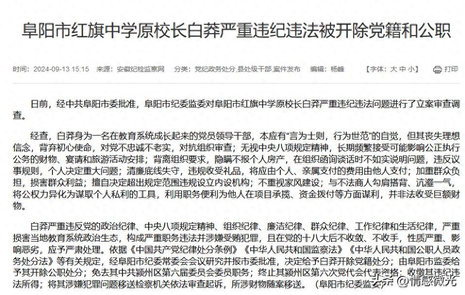 阜阳市红旗中学校长白莽被“双开”:从教育精英到贪腐落马的沉沦