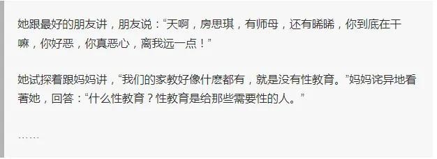 房思琪被李国华诱奸之后,有一次假装无意对母亲说道:“我们的家教好像什么都有,就是没有性教育。”妈妈惊诧地回答:“什么性教育?性教育是给那些需要性的人。”