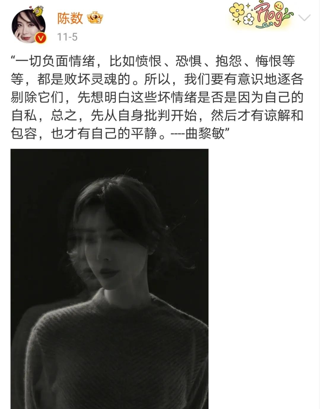 照片曝光后,赵胤胤和陈数一如既往地用沉默应对,只是陈数一直在分享她的照片和心情。