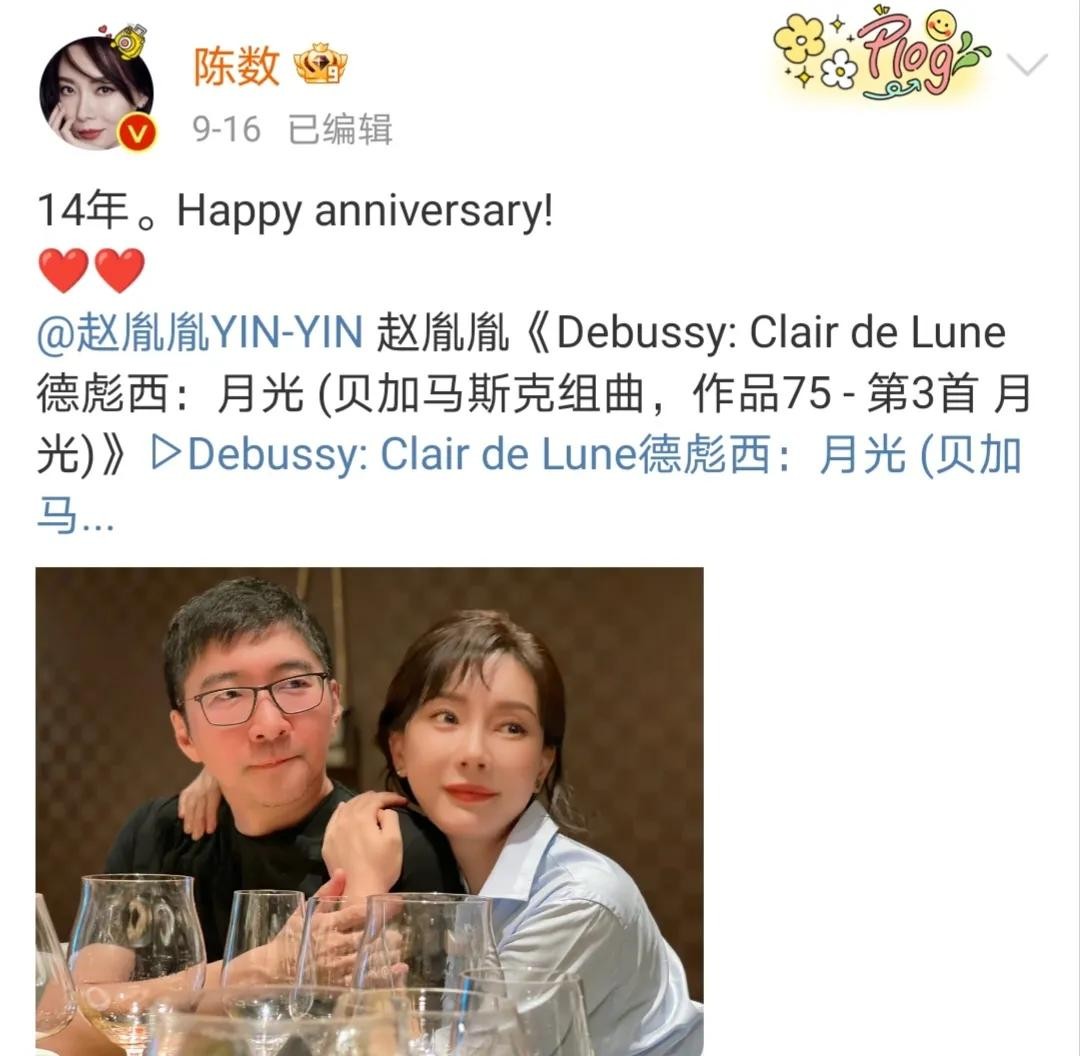 就在不久前的结婚纪念日,陈数还分享了她和赵胤胤的合照,庆祝结婚14周年。
