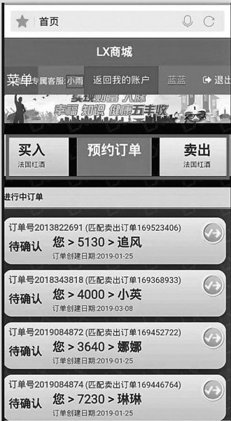 王先生所说的“理想家园”是一个所谓的进口红酒销售平台,加入该平台成为会员后可以买卖法国红酒,每瓶1000元。会员一般需要每天早上在平台上“抢单子”,一单2万元,抢到后付钱,一段时间后,平台会帮会员以23000元的价格再把这些红酒卖出去,挣到的3000元就会打给会员。“你抢的单子越多,也就意味着挣的钱越多。”王先生说。