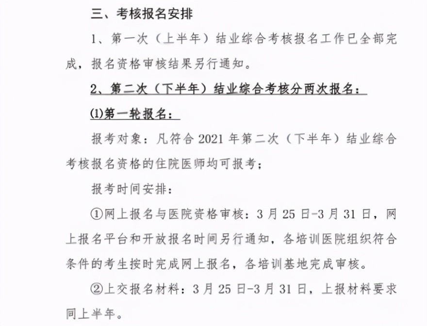 而根据上海市 3 月 12 日发布的《关于做好 2021 年度上海市住院医师规范化培训结业综合考核有关工作的通知》,在考核报名安排中,明确规定了第一轮报名与第二轮报名,其中,第二轮报名的报考对象为结业综合考核临床技能考核部分未通过者,即只补考临床技能部分的考生。